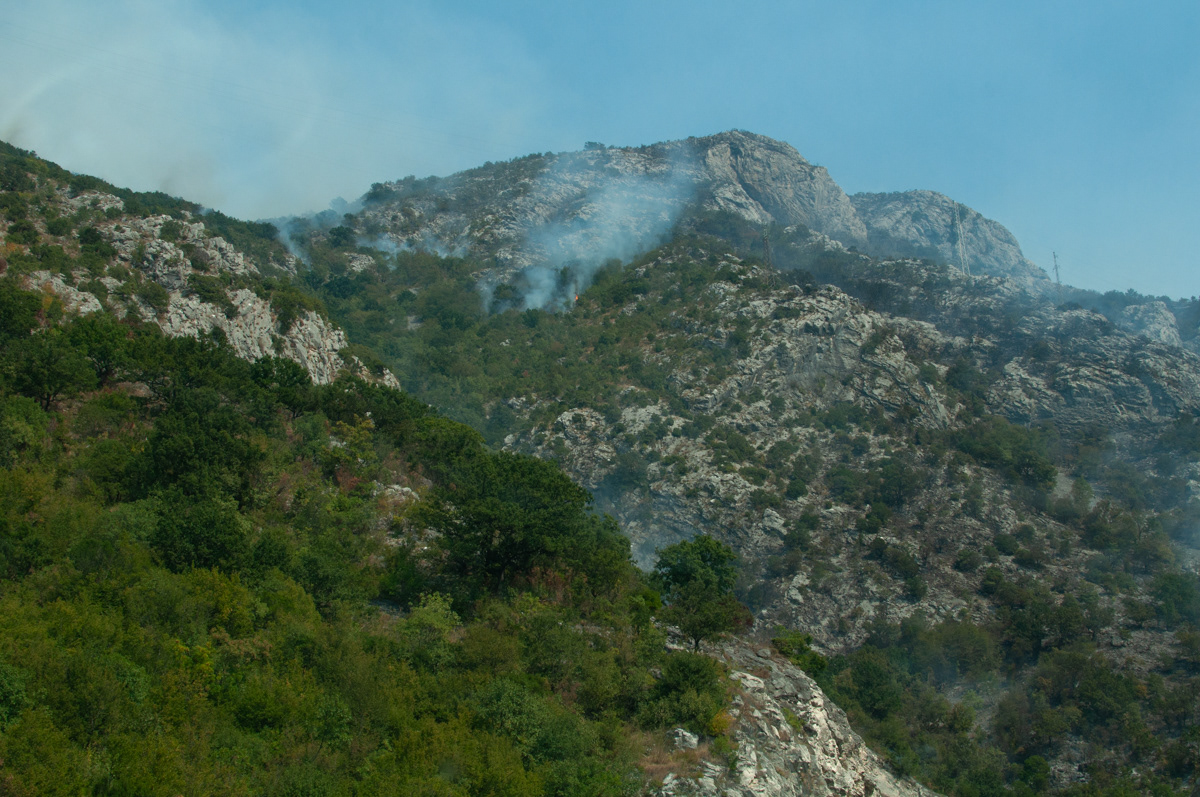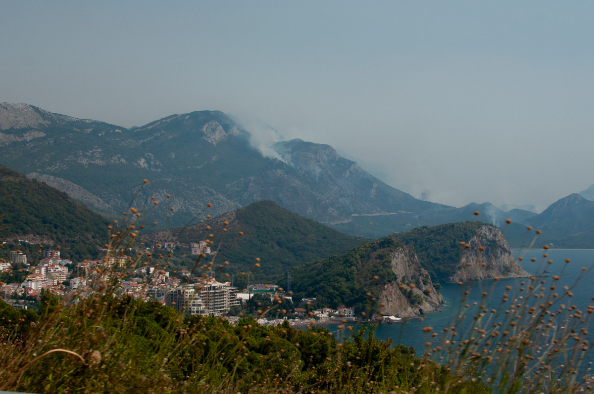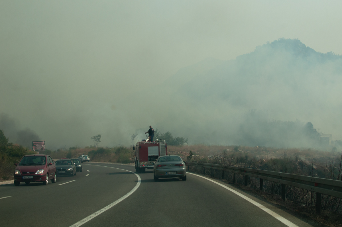 Kierując się dalej na południe w stronę Albanii, z każdą godziną czuliśmy coraz większy upał. Powietrze drżało od gorąca. Nagle, w rejonach Budvy, dostrzegliśmy gęstą chmurę dymu – początkowo myśleliśmy, że to skutek wypadku drogowego. Chwilę później wiedzieliśmy już, że to ogień – bezlitosny, rozszalały żywioł pochłaniający wzgórza wokół nas. Wysokie temperatury, susza i silny wiatr sprawiły, że ogień rozprzestrzeniał się błyskawicznie, zmuszając do ewakuacji turystów i mieszkańców z niektórych obszarów.