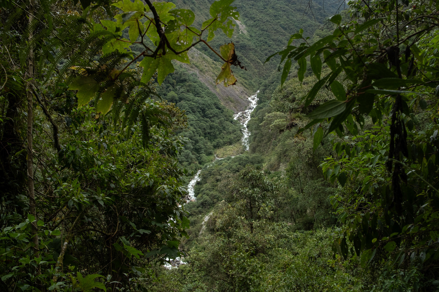 The lower we descended toward the jungle, the heavier the rain became. With every meter, however, the landscape grew greener and more tropical. Eventually, we reached an extraordinary place: towering above us were raw, snow-covered glaciers, from which long, narrow waterfalls cascaded down, while all around us the lush green jungle pulsed with life.