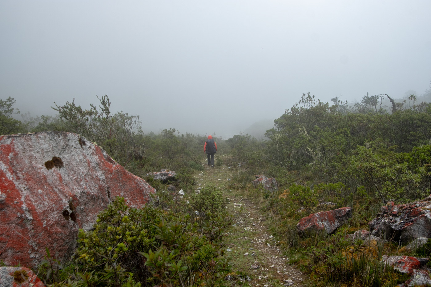 Mimo kurtki przeciwdeszczowej byłem kompletnie przemoczony, łącznie z butami. Nie było też ani kawałka płaskiego terenu, żeby rozbić namiot. Każdy postój tylko pogarszał sytuację, więc jedyną opcją było iść naprzód — szybki marsz stał się moją medycyną.