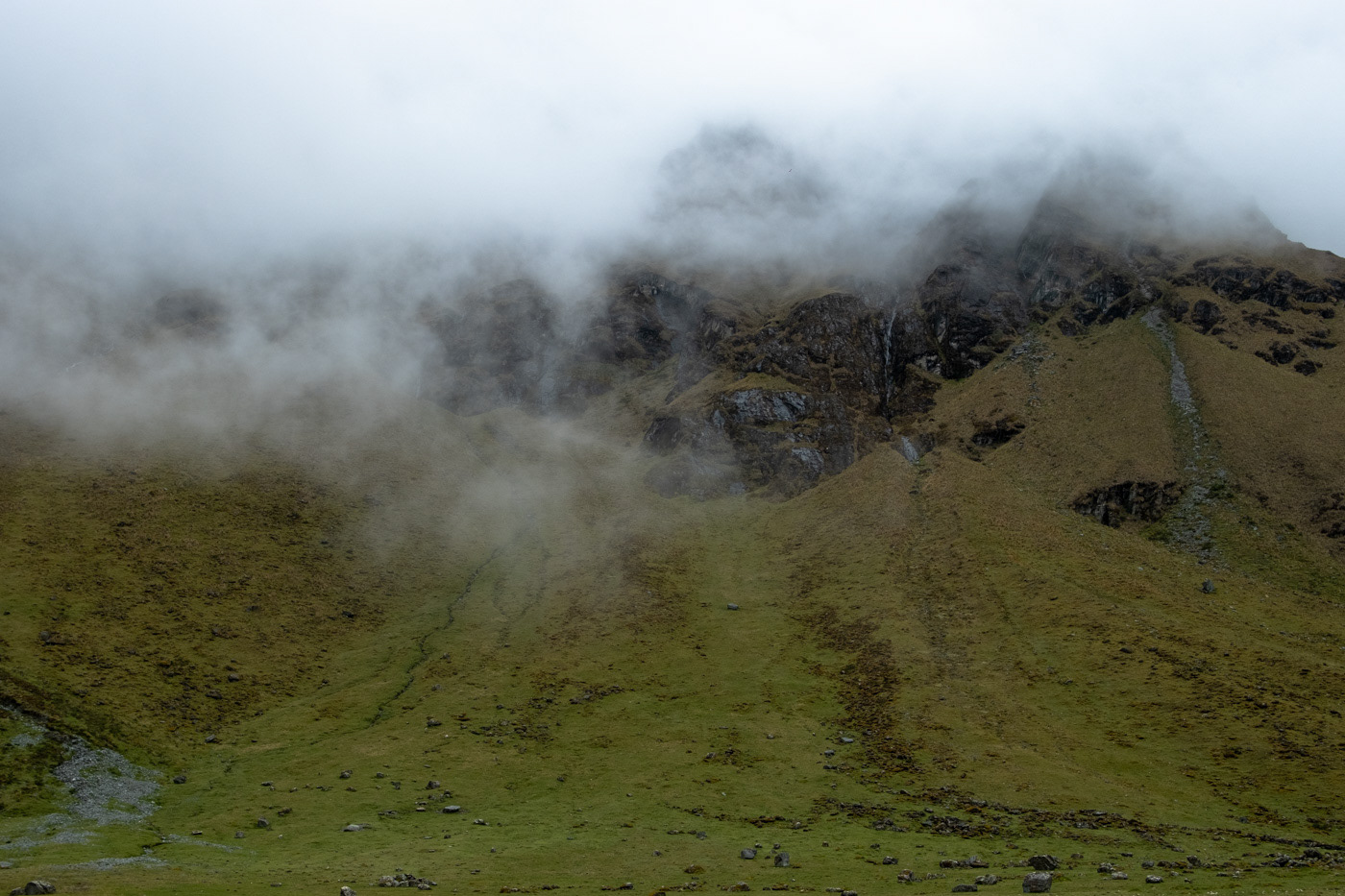 Despite my rain jacket, I was completely soaked, boots included. There wasn’t a single flat patch of ground where we could pitch a tent. Every stop only made things worse, so the only option was to keep moving — a steady, fast pace became my medicine.